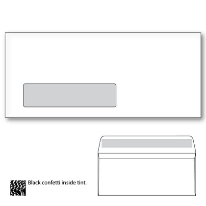 4-1/8" x 9-1/2", White Wove Commercial Window Envelope with Black Confetti Tint. Side Seam, 24LB, Peel & Seal. Envelopes for your everyday use. These envelopes are ideal for using with automated mail handling equipment announcements, invitations, business or personal correspondence. Commercial Window Envelopes offer a crisp, clean, professional look. (2500 per Carton)