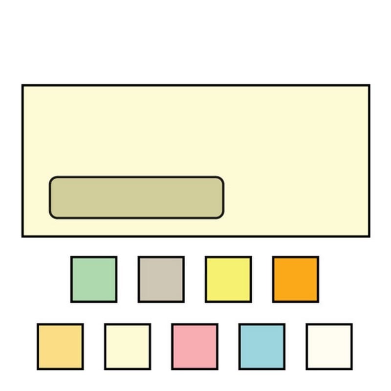 4-1/8" x 9-1/2" (4.125" x 9.5"), Poly Window Envelope, A Style Window 1-1/8" x 4-3/4" Window Size, 3/4" From Left, 1/2" From Bottom, Prism, Recycled Pastel Colored Sulphite Paper, Vellum Finish, Diagonal Seam, Flap Down, Remoistening Seal, 500 Qty / Box, 2500 Qty / Ctn, 7 lbs. per Box. 9 Color Choices Available: Creme, Oyster, Buff, Canary, Goldenrod, Pink, Green, Blue, & Gray