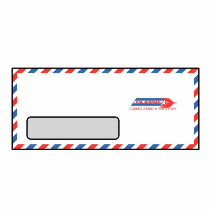 4-1/8" x 9-1/2" (4.125" x 9.5"), Service Airmail Poly Window Envelope, A Style Window 1-1/8" x 4-3/4" Window Size, 3/4" From Left, 1/2" From Bottom, White Sulphite Paper, SFI Certified, Vellum Finish, Diagonal Seam, Flap Down, Remoistening Seal, Red and Blue Airmail Border, "Par Avion" on Front & Back, 500 Qty / Box, 2500 Qty / Ctn, 6 lbs. per Box