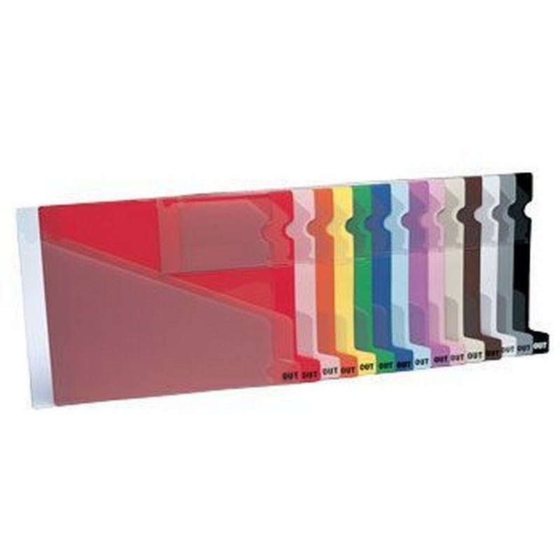 The slanted bottom tab outguides are designed with a tab at the bottom, featuring the debossed word "OUT." These outguides include a small pocket where a charge out slip can be inserted to keep track of the file's location when removed. The purpose of the large pocket is to hold any documents or information that accumulate while the file is not in its place. Measuring 13-1/4" x 9" and available in a vibrant orange color, these outguides are sold in packs of 25.