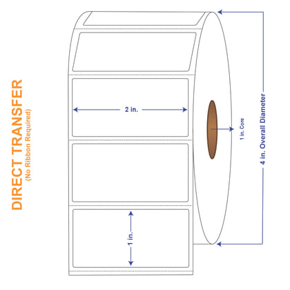 White Direct Print Thermal Labels measure 2" X 1" and have 1400 labels per roll with 4 rolls in a carton. It is made from a Fasson Direct-Therm 300LD facestock. Fasson Direct-Therm 300LD is a smooth, non-topcoated bright white paper with a high sensitivity thermal coating. It is intended for use in dry applications. Exposure to contaminants such as water, oil, alcohol and other liquids can affect the thermal layer. This product is suitable for use in a wide variety of direct thermal label printers, especially those typically used in industrial applications. These labels use a general purpose permanent emulsion acrylic adhesive designed for excellent adhesion to corrugated cardboard and superior adhesion to plastics. This adhesive meets the requirements of FDA CFR 175.105 for indirect food contact.