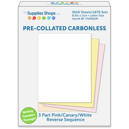 3-Ply pre-collated carbonless sheets are individual sheets, collated to provide consistent information throughout the set of forms. These sheets are perfect for laser, inkjet and digital printers and copiers. Pre-collated carbonless sheets are often used by hospitals, data processing centers, insurance companies, and even schools to create multi-part forms. The most common uses for these forms include multi-part invoices, delivery receipts, PO's, statements, packing lists, medical forms, and any other application where you want to duplicate content. The options of white, canary and pink make it easy to determine which copy goes to whom, keeping your filing system consistent. Our pre-collated carbonless sheets ensure strong, clear and legible writing on the last part of the form. Carbonless pre-collated paper is packaged in reams of 167 sets (501 sheets), and comes 10 reams per carton for a total of 1670 sets (5010 sheets) of carbonless paper. Ships in 5 to 7 business days.