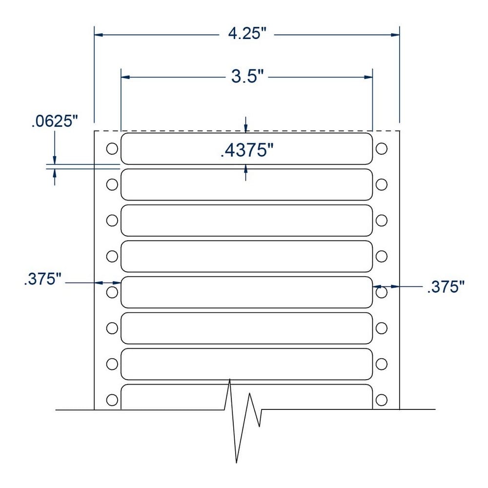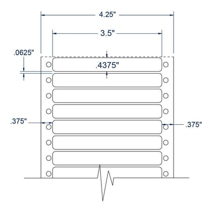 One Across White General Purpose pinfeed Labels are 7.1 mil thick with a weight of 122 pounds per ream of 25" x 38" sheets. The face paper of these labels is a 50# data surface sized lignin-free machine finished paper. These multipurpose labels are designed for information labeling, impact, and nonimpact printing. The opacity of the face stock is 90% with a 93% brightness rating. The adhesive used on these labels is a modified acrylic adhesive. The minimum labeling temperature for this type of adhesive is 32deg Fahrenheit, with a service temperature range from -4degF to 176degF. A 3.2 mil white kraft machine finished liner completes this label. Developed for continuous EDP pinfeed applications, this label liner is ideal for folding and friction feed applications. The shelf life of these labels when stored at 70degF and 50% relative humidity (RH) is one year. Color: White, Size: 3.5" x 0.4375" - 10,000 Labels per Carton