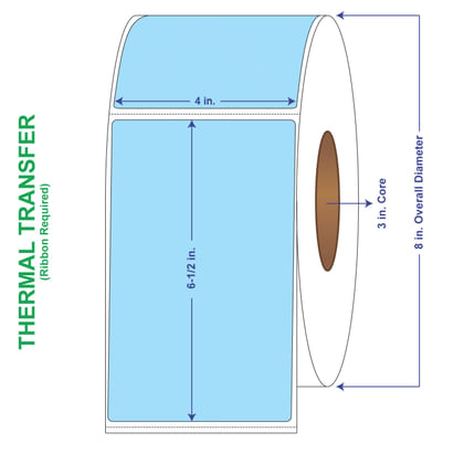 General Use Label w/ Perf Tinted Thermal Transfer Labels come 900 labels per roll and 4 rolls per carton for a total of 3600 labels per box. These thermal transfer label rolls have an 8" outer diameter and 3" core. Perforated thermal transfer labels have a horizontal perf every 6-5/8". A versatile general purpose permanent emulsion acrylic adhesive offers excellent initial tack and ultimate adhesion, especially at lower temperatures, without sacrificing high-speed converting. This adhesive meets the requirements of FDA CFR 175.105 for indirect food contact. The minimum application temperature for this adhesive is 30°F and the recommended service temperature range is -65°F to 200°F (-54°C to 93°C). These labels use a 40# basis weight.