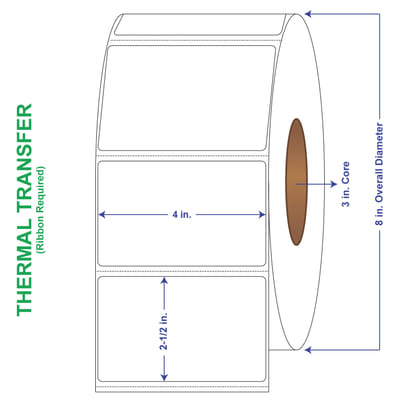 General Use Label w/ Perf Thermal Transfer Labels come 2500 labels per roll and 4 rolls per carton for a total of 10000 labels per box. These thermal transfer label rolls have an 8" outer diameter and 3" core. Perforated thermal transfer labels have a horizontal perf every 2-5/8". A versatile general purpose permanent emulsion acrylic adhesive offers excellent initial tack and ultimate adhesion, especially at lower temperatures, without sacrificing high-speed converting. This adhesive meets the requirements of FDA CFR 175.105 for indirect food contact. The minimum application temperature for this adhesive is 30°F and the recommended service temperature range is -65°F to 200°F (-54°C to 93°C). These labels use a 40# basis weight.