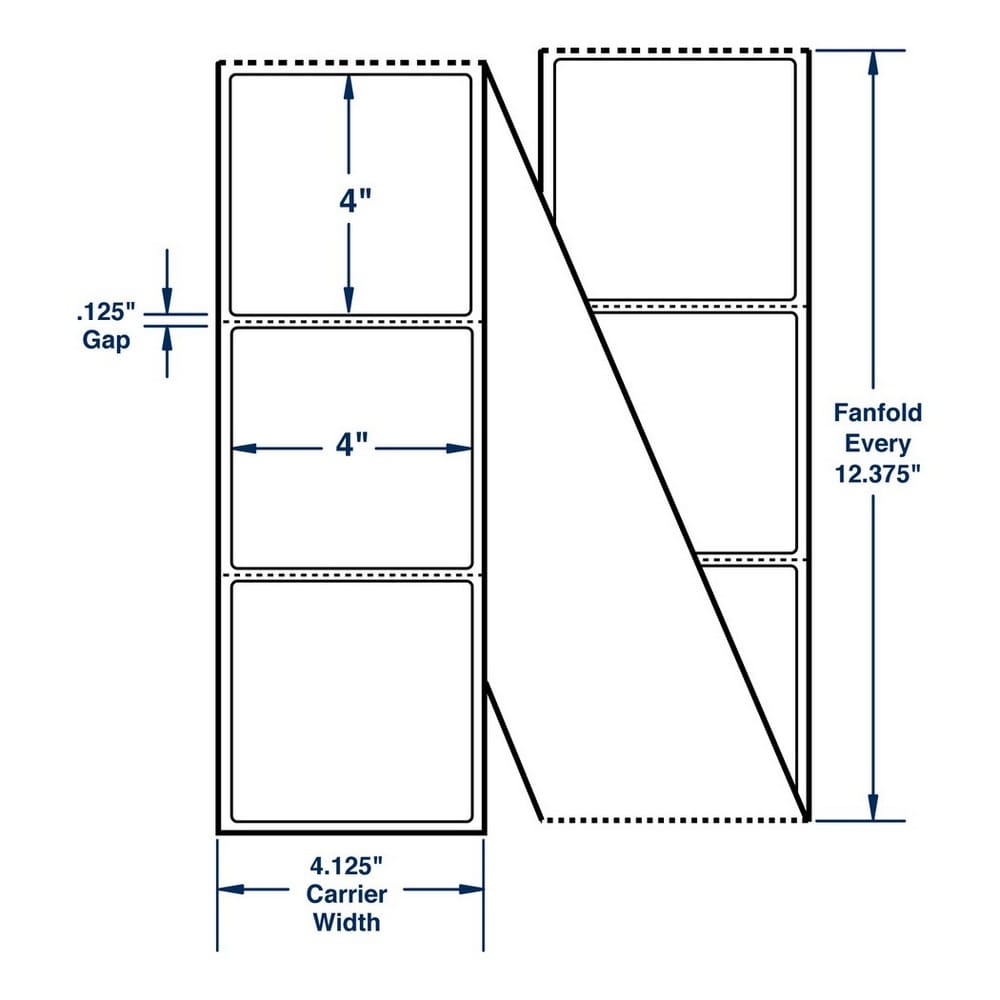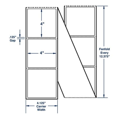 White Fanfolded with Perf Direct Print Thermal Labels, are 6.2 mil thick with a weight of 112 pounds per ream of 25" x 38" sheets. The face paper of these labels is a direct thermal non top-coated, non smudge-proof, chimi-thermal paper with standard sensitivity. These labels are designed for VIP labeling in dry environments such as POS price marking and other retail uses. When using these labels, contact with plasticizers (PVC) and fat should be avoided. The opacity of the face stock is 92% with a 90% brightness rating. The imaging color to display on the label is black and the scanability is visible red light. The adhesive used on these labels is a modified acrylic dispersion permanent adhesive. This is a very good adhesive for a wide variety of substrates. The minimum labeling temperature for this type of adhesive is 32deg Fahrenheit, with a service temperature range from -4degF to 176degF. A 40# (2.5 mil) white kraft liner completes this label. The label liner is ideal for roll stock applications and photocell dispensing. The shelf life of these labels when stored at 70degF and 50% relative humidity (RH) is one year. Size: 4" x 4", Color: White. 2850 per stack 2 Stacks per Carton)