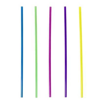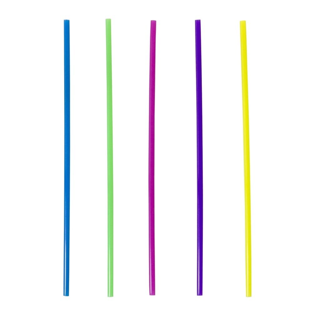 These polypropylene straws are 7-3/4" and are slim and come in assorted neon. They are unwrapped and loose (500/Box, 10 Boxes/Case).