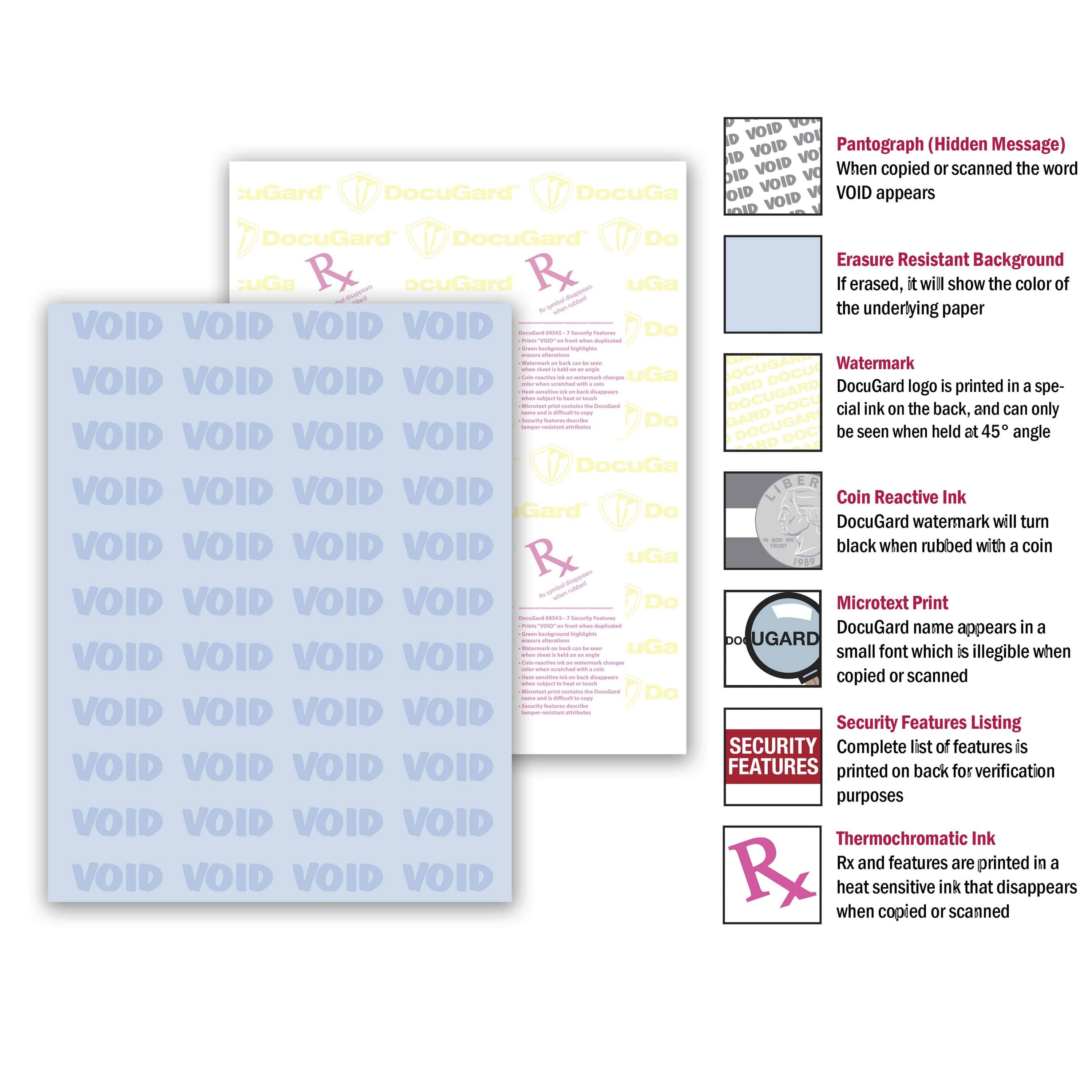 8-1/2'' x 11" Advanced Blue Medical Security Paper, 7 Security Features, 24# Blue Stock (Carton of 2500). Document fraud is growing at an alarming rate and every business is vulnerable. Today's technology has made document alteration and duplication easy for criminals. A document with multiple security features is much more difficult to duplicate using a copier, scanner, or camera. DocuGard medical security paper, with 7 features per sheet, ensures maximum protection against fraud. All DocuGard medical security papers exceed the guidelines set by the Centers for Medicare and Medicaid Services (CMS). These medical security papers feature hidden void pantograph, erasure resistant color background, microtext printing, DocuGard watermark, coin reactive ink, security features listing, and heat sensitive thermochromatic ink. This security paper comes with 5 reams per carton, for a total of 2500 sheets per carton.
