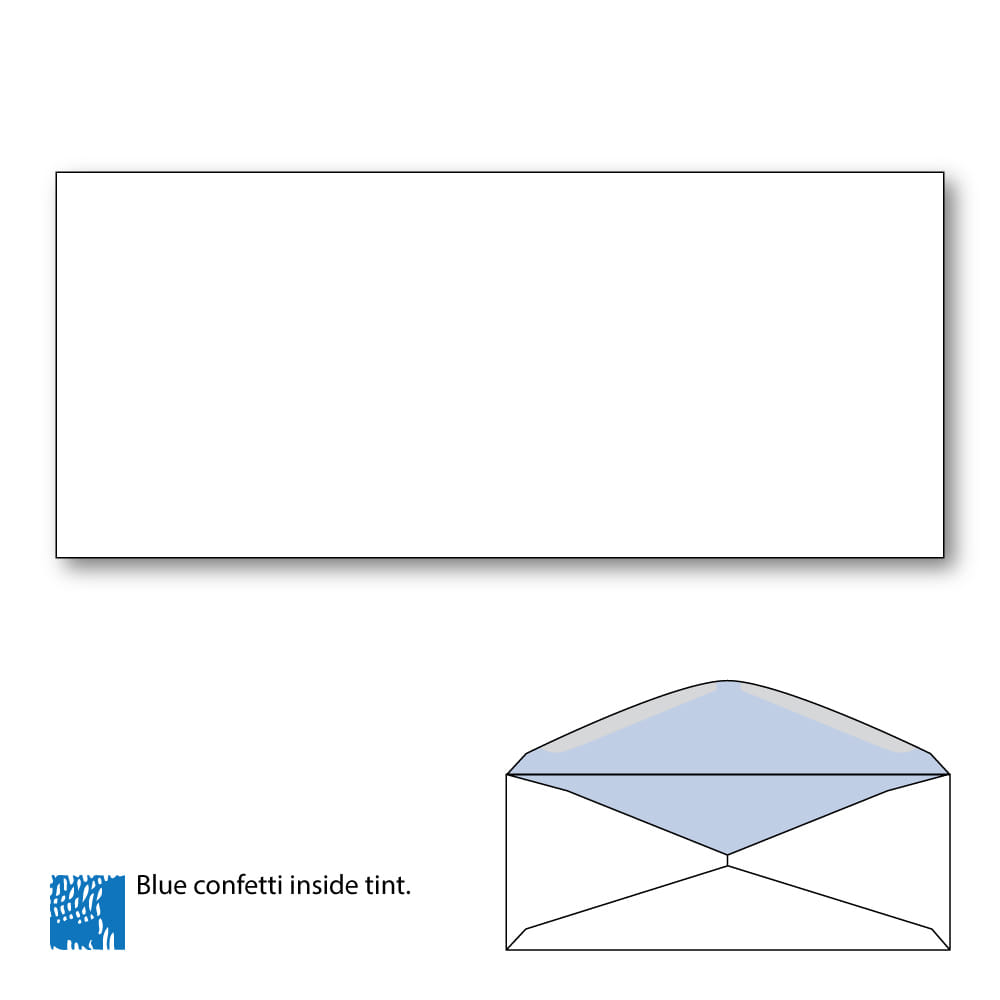 3-7/8" x 8-7/8", White Wove Commercial Envelope with Blue Confetti Tint. Side Seam, 24LB, No Window. Envelopes for your everyday use. These envelopes are ideal for using with automated mail handling equipment announcements, invitations, business or personal correspondence. Commercial Envelopes offer a crisp, clean, professional look. (2500 per Carton)