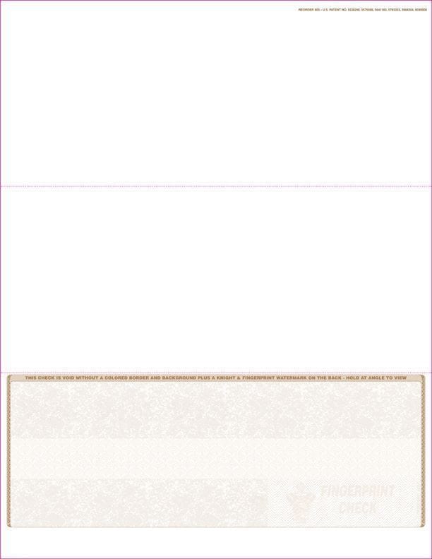 This is a brown-colored laser check form with the check itself in the bottom position and equipped with Fingerprint II security measures in order to prevent fraud. The three panels are divided evenly, each being 3-2/3" tall. This product is sold in reams of 500 sheets.