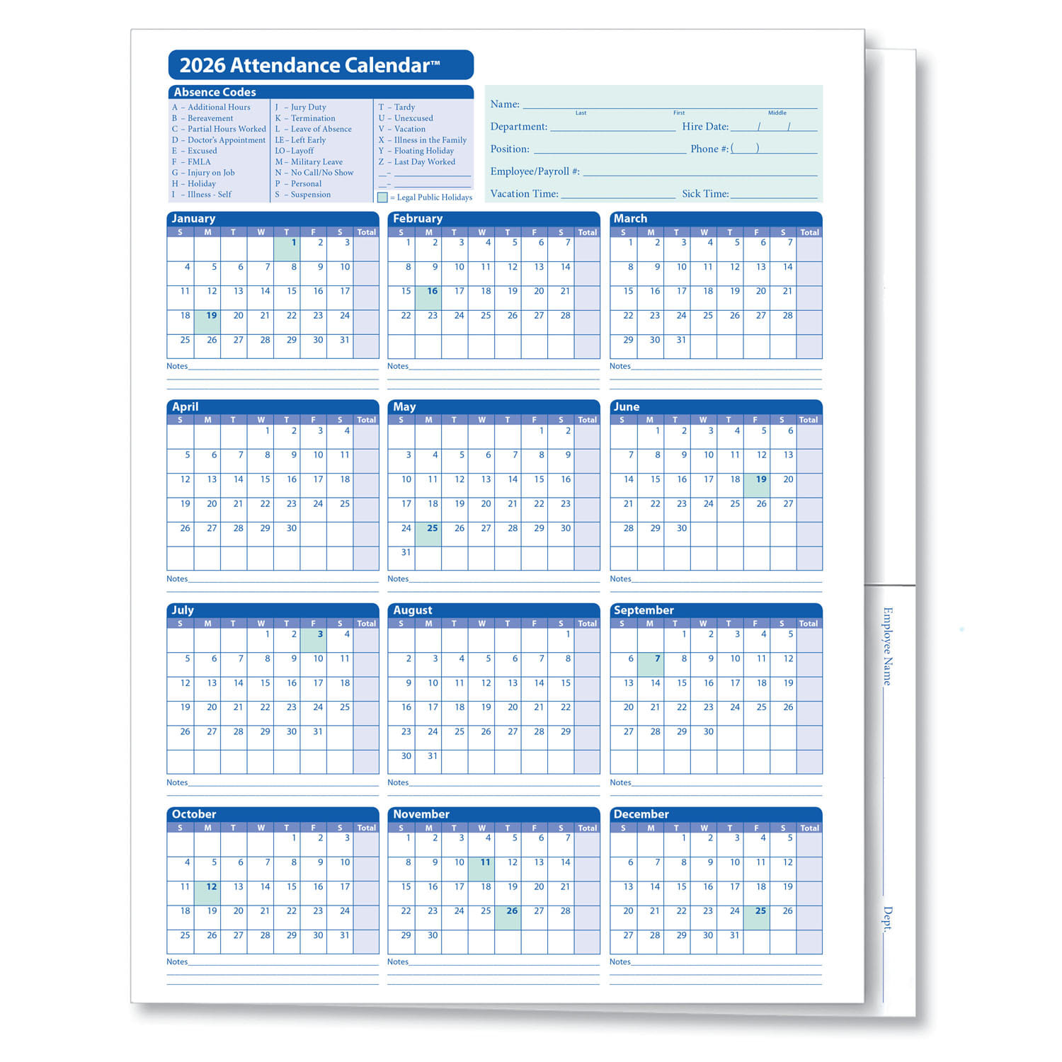 One simple solution pulls double duty with the Attendance Calendar Folder. On the outside, mark employee attendance on the same easy-to-use format as our popular Attendance Calendar Card. On the inside, store any and all material related to attendance: vacation requests, emails, warnings and more.