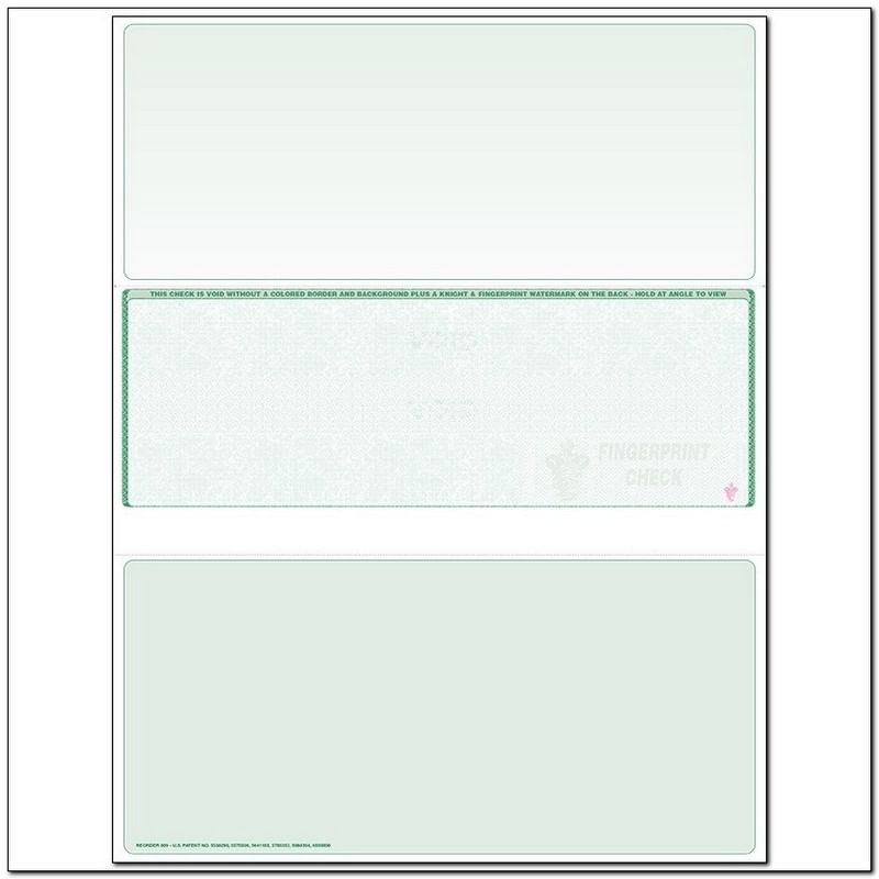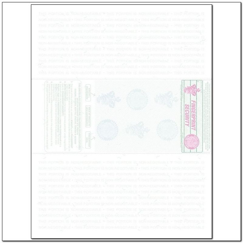 This is a green-colored laser check form with the check itself in the middle position and equipped with Fingerprint II security measures in order to prevent fraud. The three panels, from top to bottom, measure 3-1/2", 3-1/2", and 4" tall. This product is sold in reams of 500 sheets.