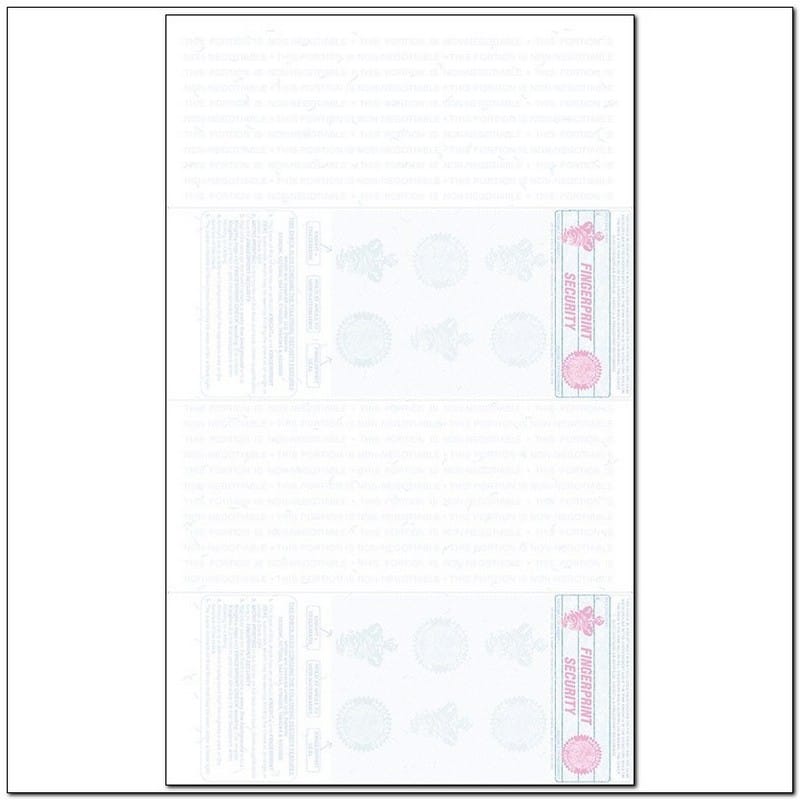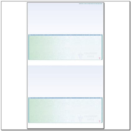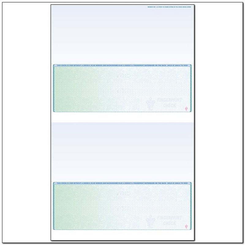This is a laser check form with the check itself in the bottom position and equipped with Fingerprint II security measures to prevent fraud; it is colored with a green-to-blue horizontal gradient. The four panels are divided evenly, each being 3-1/2" tall. This product is sold in reams of 500 sheets.