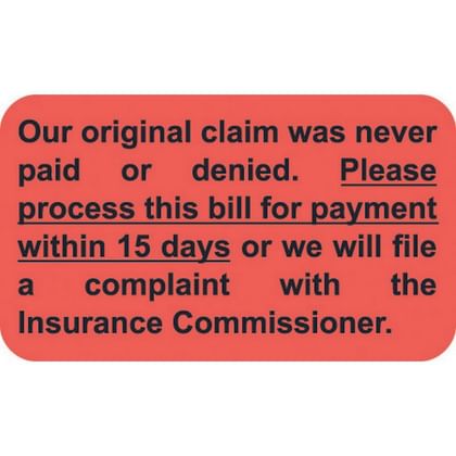| Legend: | Our original claim was never paid or denied. Please process this bill for payment within 15 days or we will file a complaint with the Insurance Commissioner. | Material: | Paper stock | |