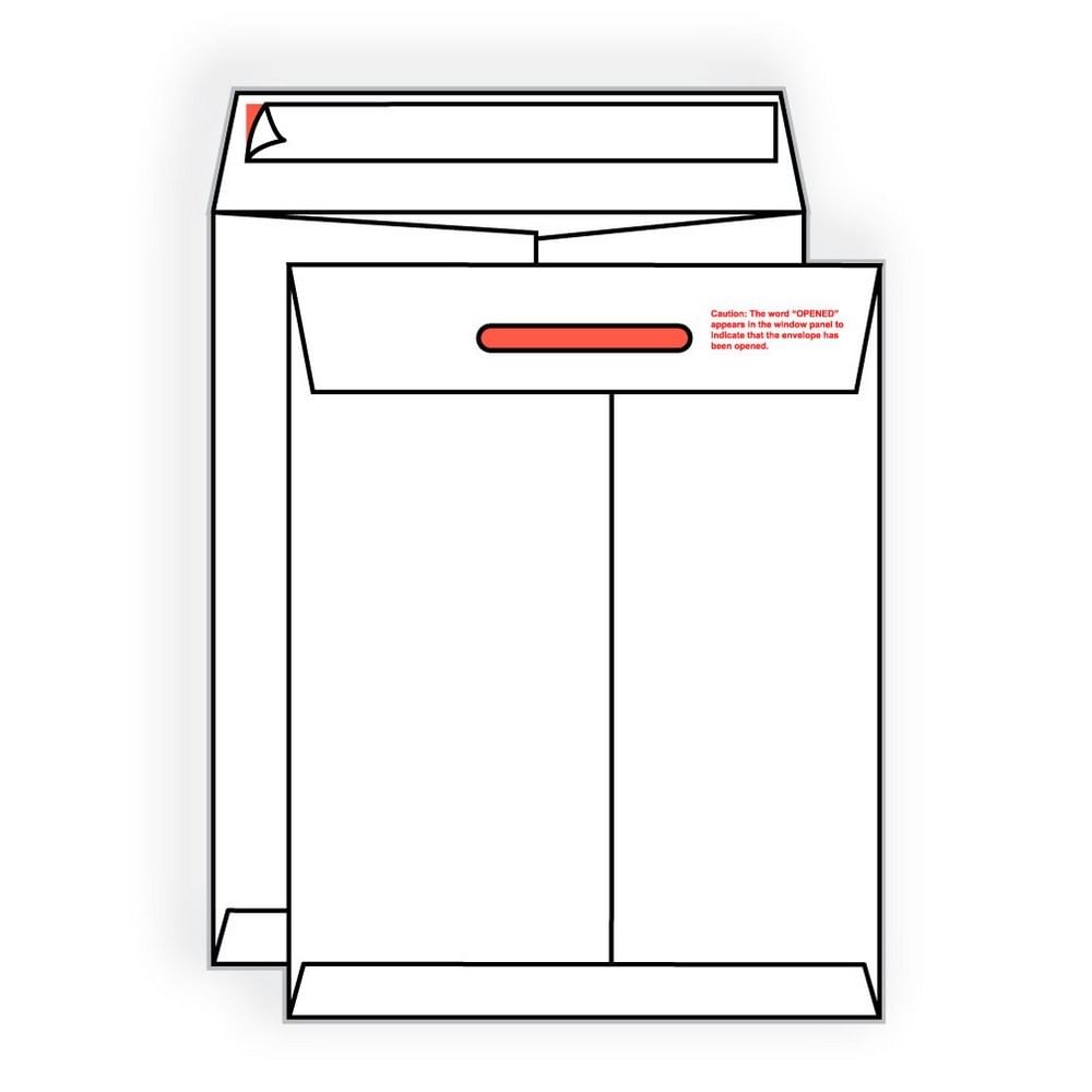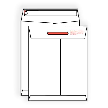 9" x 12", Open End Tamper Evident Kwik-Tak, 14#, Bright White Spun Bonded Olefin, Smooth Finish, Moisture Resistant, Center Seam, No Window, Pressure Sensitive Seal, Flap reads "Opened" when Seal is Broken