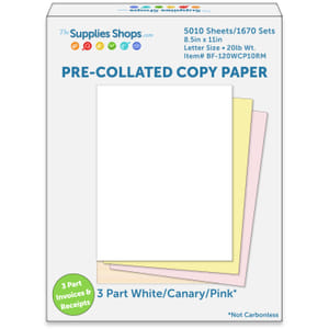 8-1/2" x 11" Pre-Collated 20# Colored Paper, 1670 White / Canary / Pink Sets (Carton of 5010 Sheets)