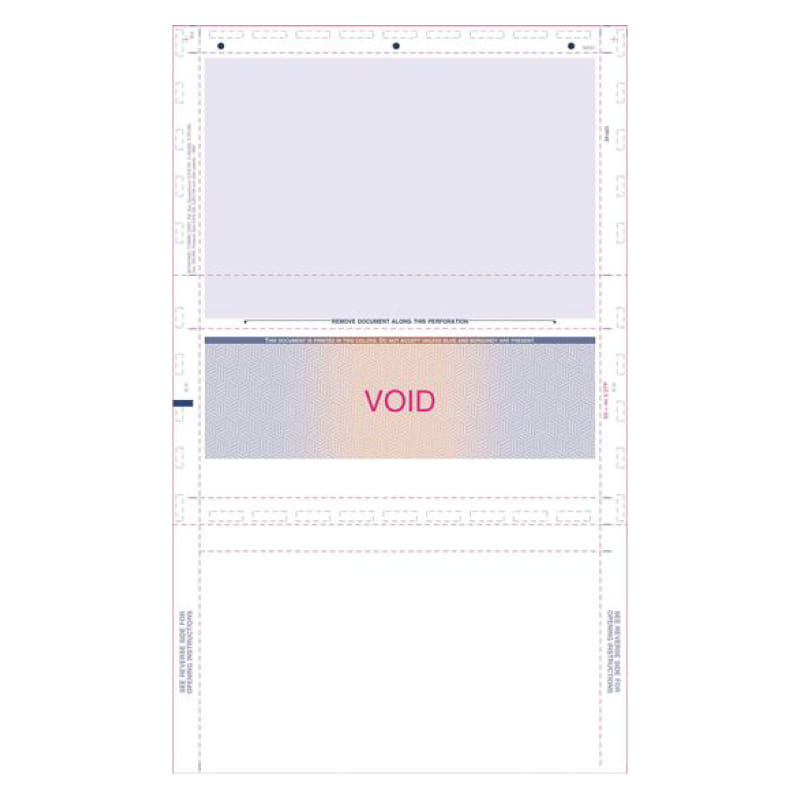 This is a laser check form with the check itself in the middle position; it is colored with a red-to-blue horizontal gradient. The three panels are divided evenly in Z-fold format. This product is sold in cartons of 2000 sheets.