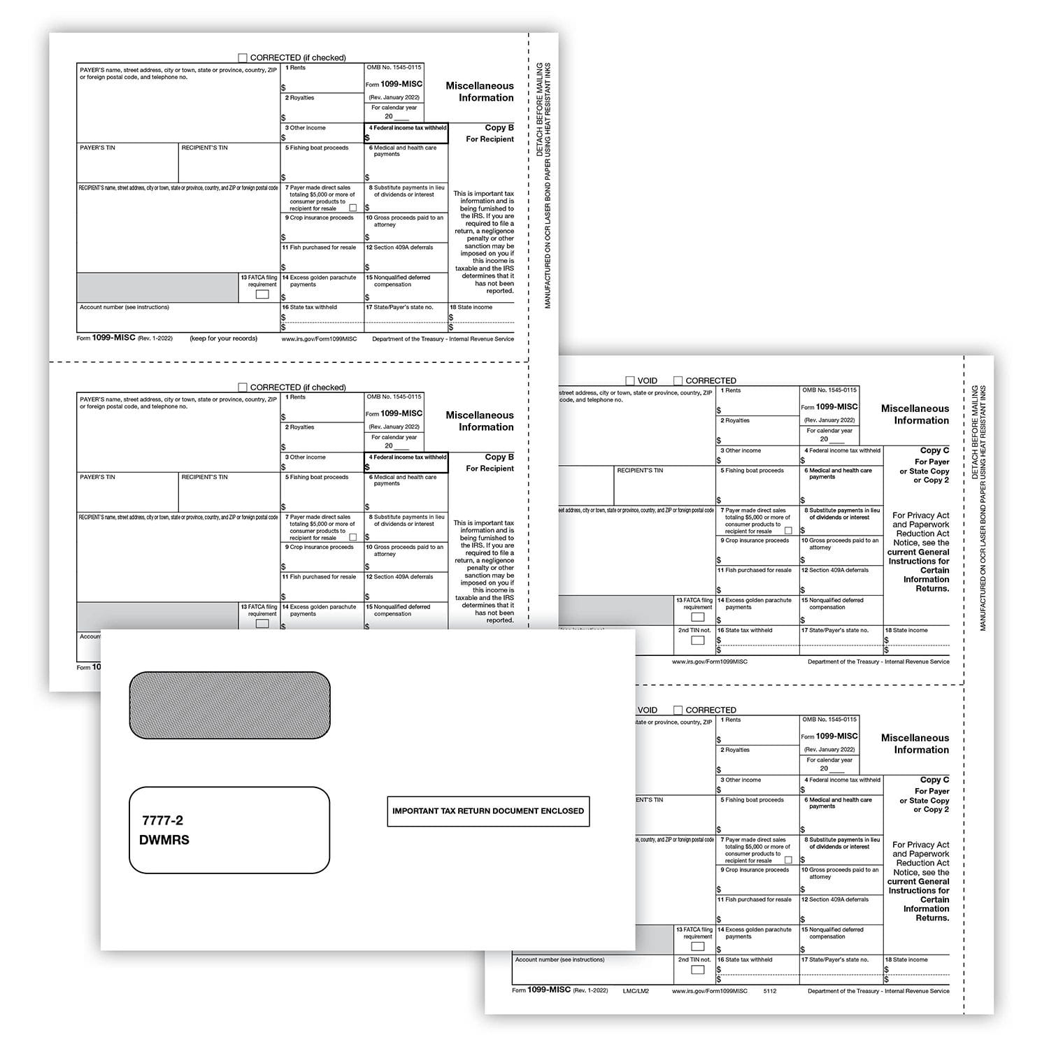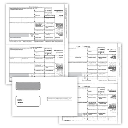 The TFP 1099-MISC Packaged Laser Set for Electronic Filing, designed for 25 employees and accompanied by envelopes, is a convenient solution for those looking to electronically file their 1099-MISC forms. This 3-part set comprises 25 sets of 1099-MISC Copy A Federal Forms (5111) for IRS reporting, 50 sets of 1099-MISC Copy B Recipient Forms (5112) for providing income information to recipients, and 25 double-window envelopes (77772) for easy mailing. It streamlines the electronic filing process while ensuring adherence to IRS regulations by supplying the necessary forms for both IRS reporting and recipient distribution.