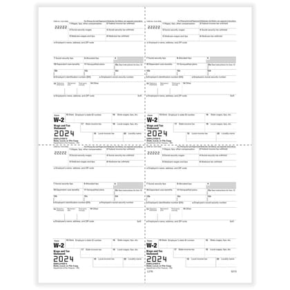 The TFP W-2 M-Style Alternate 4-Up Employer’s Copies 1/D, 1/D, 1/D, 1/D pack includes 500 sheets, and each sheet is designed to accommodate four copies of a single tax form. These forms are typically used by employers for tax reporting purposes and include copies 1/D, 1/D, 1/D, and 1/D. Each sheet is a standard letter size, measuring 8-1/2" x 11". Additionally, these sheets are perforated into quarters, which makes it easy to separate the individual copies cleanly. This packaging is ideal for organizations that need an efficient way to generate multiple employer tax documents while ensuring compliance with tax regulations.