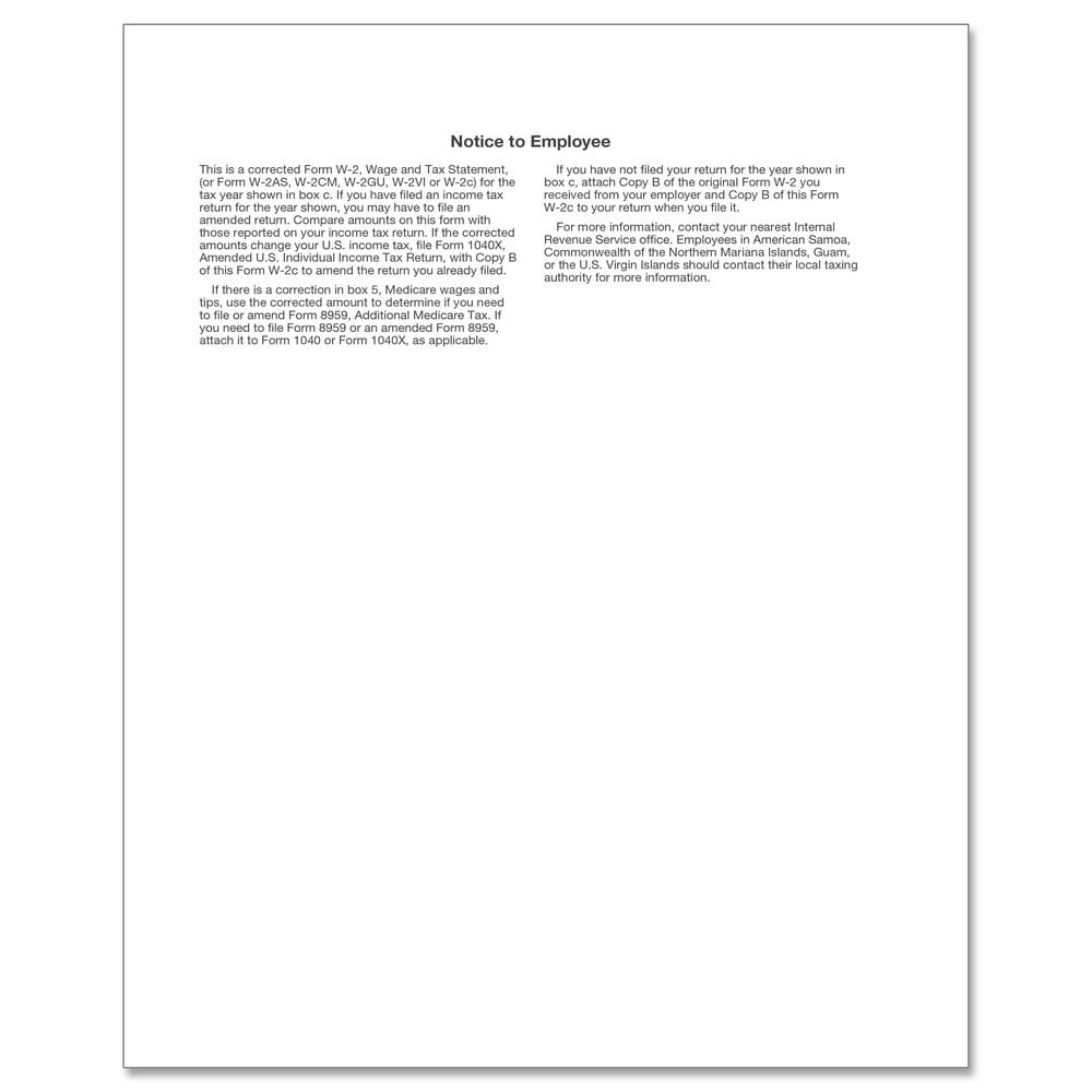 The TFP W-2C Corrected Income Employee’s Copy C and/or State, City, Local Copy 2 pack, containing 1000 sheets, is designed with efficiency in mind. Each sheet, measuring 8-1/2" x 11", is tailored to accommodate one form, aligning perfectly with the one-page-to-one-form format. This arrangement streamlines the process of handling and organizing corrected income information, ensuring clarity and precision in reporting for state, city, and local tax purposes.